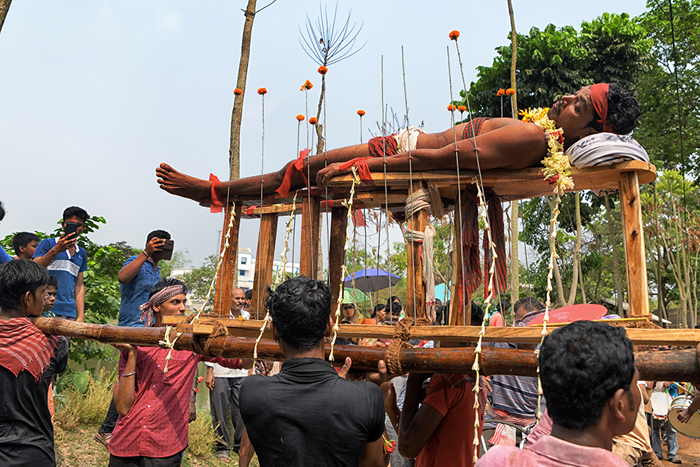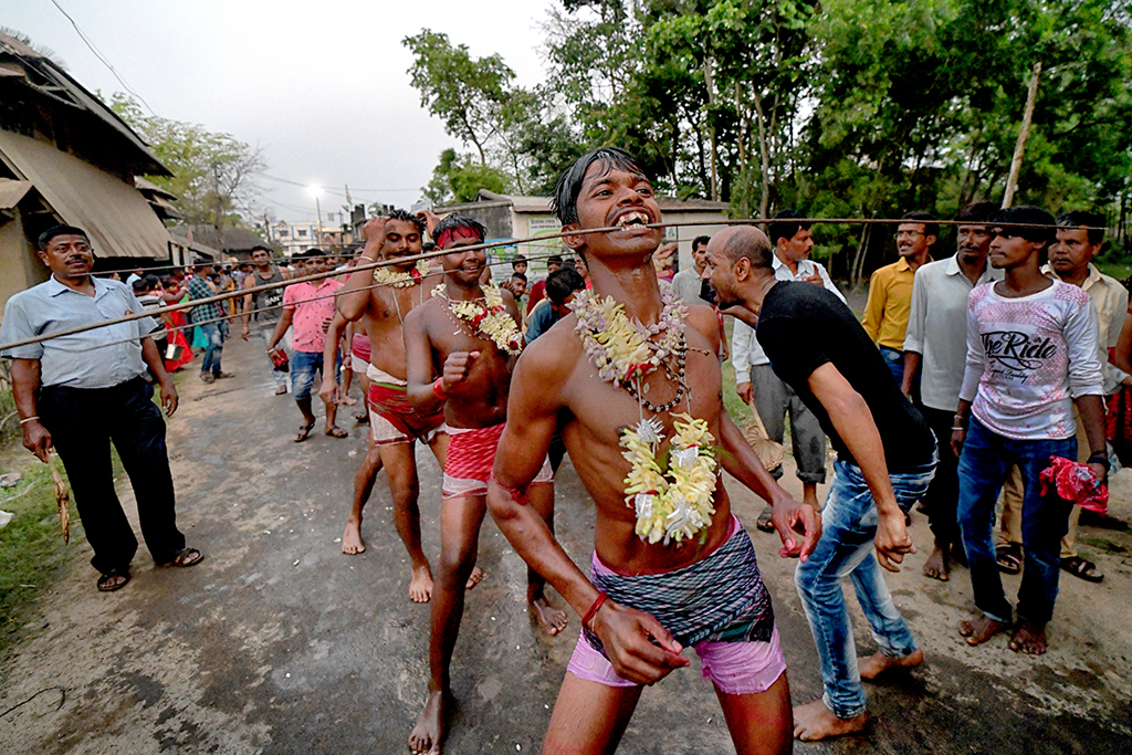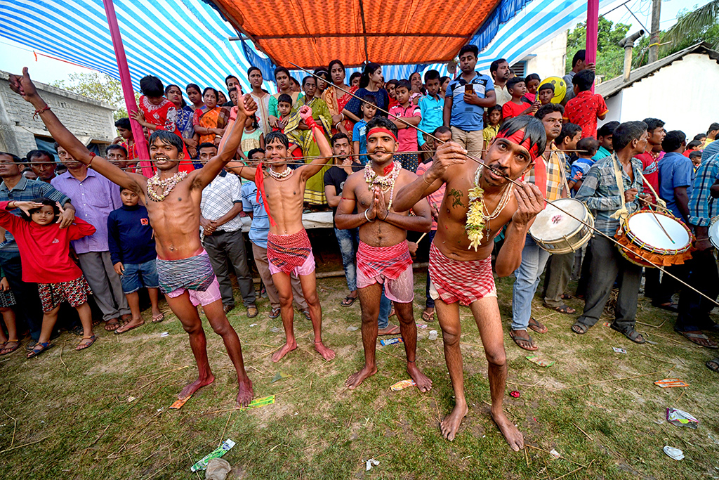 This photo story has been made during the celebration of the Gajan festival in a remote village of Hooghly district of West Bengal. The unique features of this celebration is that here villagers pierce iron rod in their body, tongue and crucify themselves by laying down on wooden framework with huge nails fixed on it.