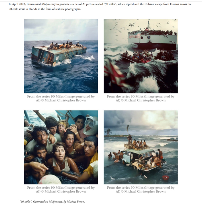 Photographer Michael Brown is a professional journalist and documentary filmmaker, and has been a photographer for National Geographic magazine since 2004. In April 2023, Brown used Midjourney to generate a series of AI pictures called "90 miles", which reproduced the Cubans' escape from Havana across the 90-mile strait to Florida in the form of realistic photographs.