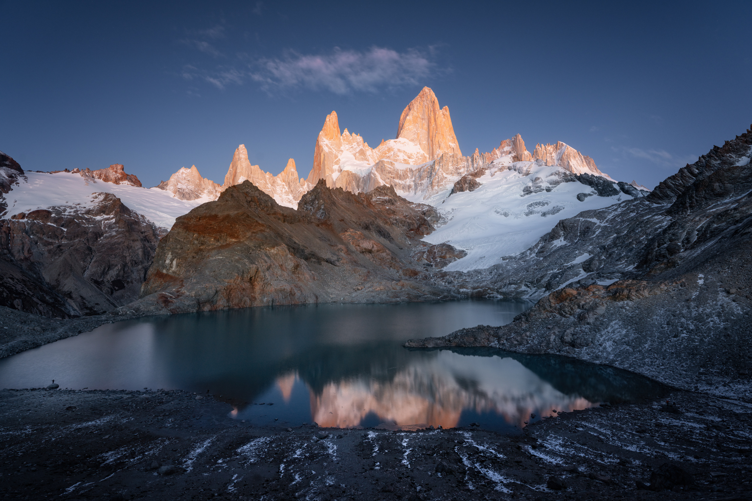 This is a photo I took last year of Fitz Roy Peak in the Patagonia region of South America. I visited this beautiful place for the first time in April 2024. We spent two nights at a campsite at the foot of the mountain and hiked two and a half hours under the stars to get there. Unlike many photographers who descended to the lakeshore to shoot, I wanted to find the best position to centre the peak in the frame and capture as much of the mountain's reflection as possible. After a long search in the dark, I finally climbed onto a large boulder and captured this image of Fitz Roy Peak during the blue hour, when the mountain was softly glowing. Photographers often say that Patagonia has two golden sunrises - the first being this stunning blue-hour glow on the peaks.